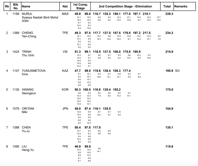 Ở lượt cuối,Nurul Syasya vẫn giữ phong độ cao khi đạt 10,7 và 10,5 điểm,trong khi Cheng chỉ đạt 9 và 7,để giành HC vàng đầu tiên cho Malaysia tại kỳ giải này.