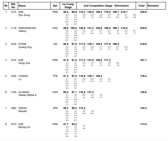 Rakhimzan bước vào lượt quyết định đấu Rim Ryu-song. Anh đạt 10,1 và 7,7 điểm,đành bất lực trước phong độ cao của xạ thủ Triều Tiên khi có 10,4 và 10,8. Rim giành HC vàng thứ ba cho Triều Tiên để củng cố ngôi đầu bảng tổng sắp huy chương.