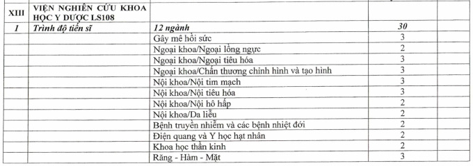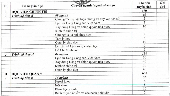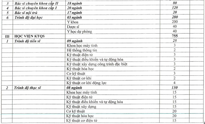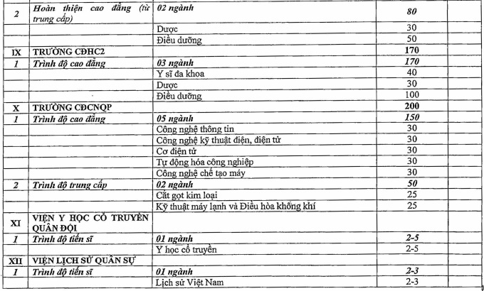 Các trình độ đào tạo từ trung cấp đến tiến sĩ,ở nhiều khối ngành như công nghệ - kỹ thuật,y dược,ngôn ngữ. Tổng số chỉ tiêu Bộ Tổng Tham mưu đề xuất là hơn 3.250. Hiện,4 trường đã công bố chỉ tiêu chính thức,đúng với đề xuất này.