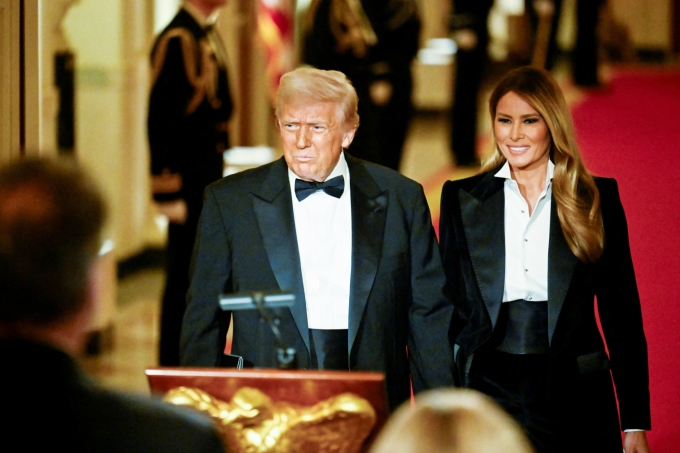 Vợ chồng Tổng thống Donald Trump cùng diện tuxedo ở sự kiện hôm 22/2 tại Nhà Trắng. Ảnh: Reuters